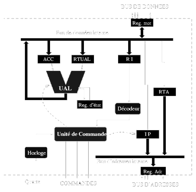 • Le fonctionnement du microprocesseur est basé sur l'architecture de Von Neumann, soit un bus d'adresses, un bus de données et un bus de contrôle.