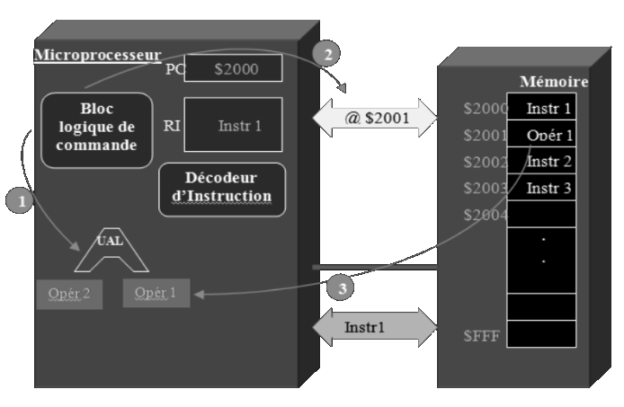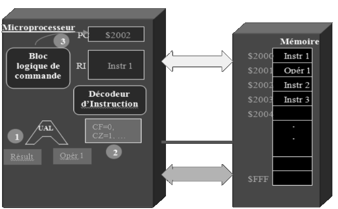 • Decoder et exécuter ces instructions. Selon la nature de l'instruction. Le microprosseur peut effectuer une lecture de données à traiter. Une ecriture de données en mémoire.