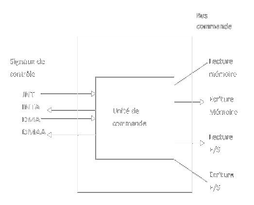 • Gestion du dialogue entre le microprocesseur, les mémoires et les interfaces d'E/S, par l'intermédiare du bus de commande et des signaux de contrôle.