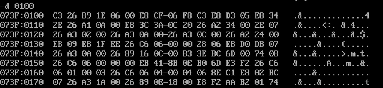 - Lancez la commande d 0100 dans le débogueur DOSBox pour afficher les octets à partir de l'adresse 073F:0100: