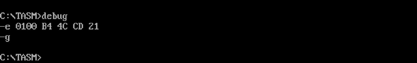 MOV DX,10B MOV AH,9 INT 21 MOV AH,4C INT 21 DB "Mon premier programme avec DEBUG",0D,0A,'$' - Lancez la commande a 0100 dans le débogueur DOSBox pour entrer les instructions à partir de l'offset 0100: