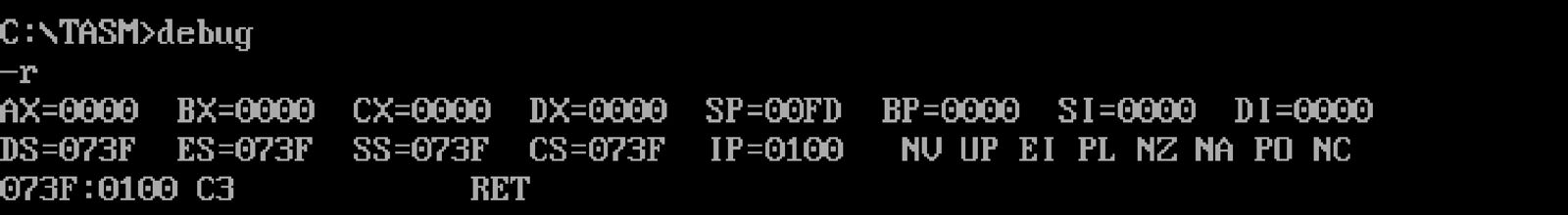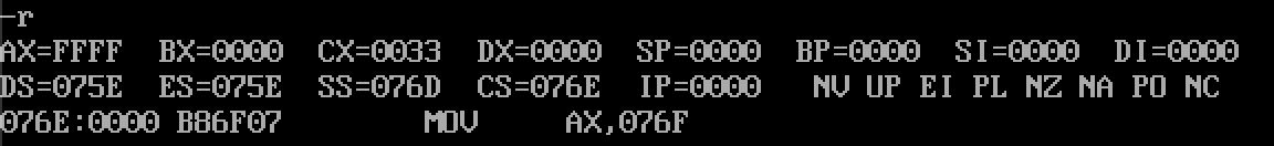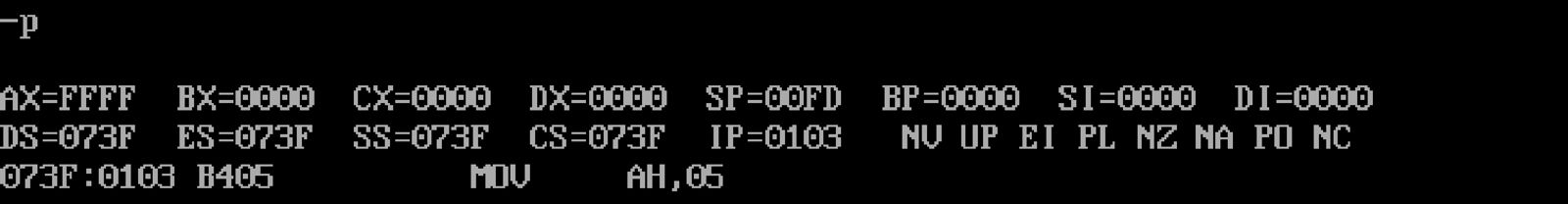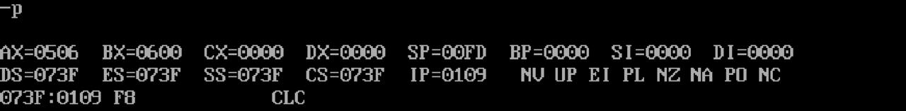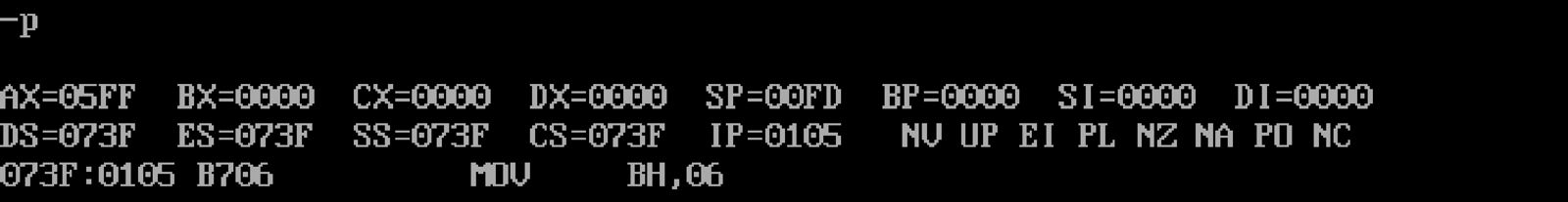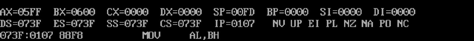 a 0100 073F:0100 MOV AX, FFFF 073F:0103 MOV AH, 5 073F:0105 MOV BH, 6 073F:0107 MOV AL, BH