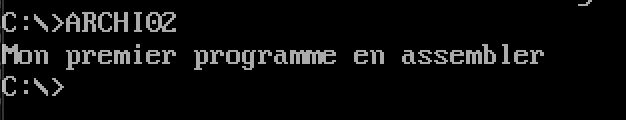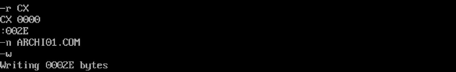 - Enregistrer le programme crée sous le nom ARCHI01.COM. (Pour enregistre ce programme, mettez dans CX le nombre d’octets qu’il occupe, utilisez n pour nommer le fichier puis la commande w pour l’écrire sur le disque)
