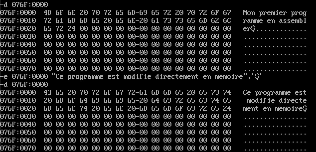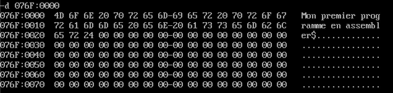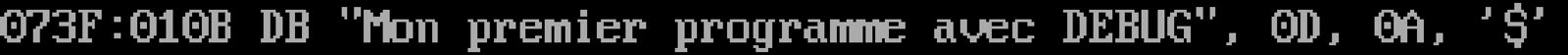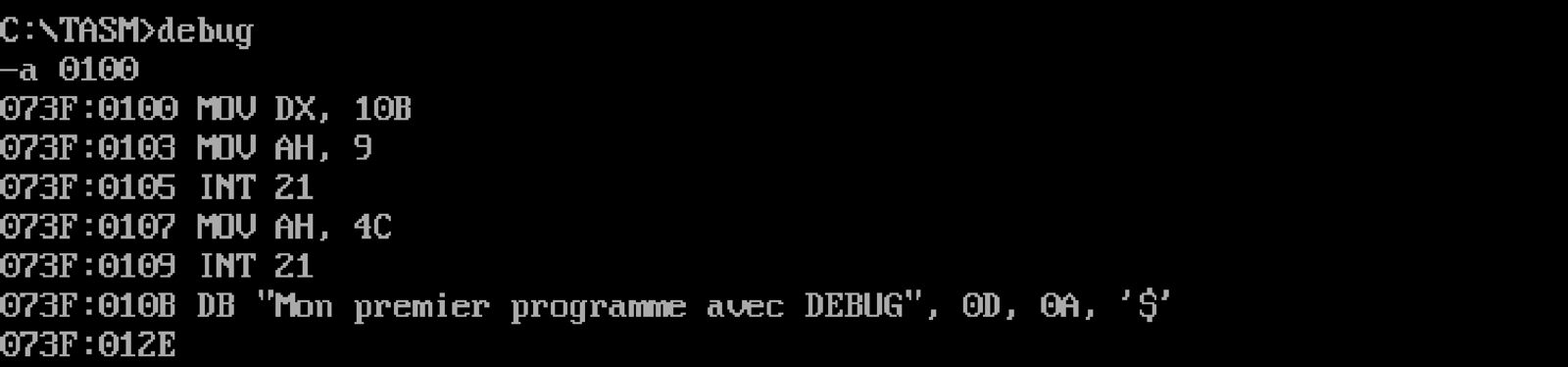 a 0100 073F:0100 MOV DX,10B 073F:0103 MOV AH,9 073F:0105 INT 21 073F:0107 MOV AH,4C 073F:0109 INT 21 073F:010B DB "Mon premier programme avec DEBUG",0D,0A,'$' 073F:012E