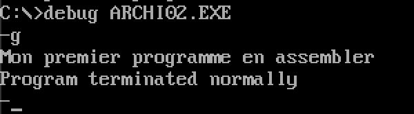 - Entrez en mode DEBUG en exécutant la commande DEBUG ARCHI02.EXE. Exécutez le programme avec la commande g. Que remarquez-vous ?