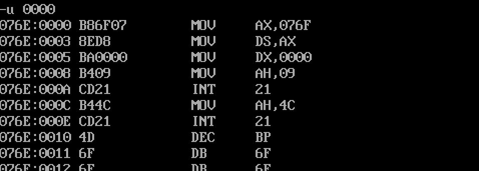 076E:0000 B86F07 MOV AX, 076F ; Charge la valeur 076Fh dans AX (adresse du segment où se trouve les données) 076E:0003 8ED8 MOV DS, AX ; Définit DS (Segment de Données) à la valeur de AX, pointant DS vers le segment 076Fh 076E:0005 BA0000 MOV DX, 0000 ; Charge la valeur 0000h dans DX (le décalage de la chaîne à afficher) 076E:0008 B409 MOV AH, 09 ; Charge la valeur 09h dans AH (fonction 09h de INT 21h pour afficher une chaîne) 076E:000A CD21 INT 21 ; Appelle l'interruption DOS 21h pour exécuter la fonction spécifiée (affichage de la chaîne) 076E:000C B44C MOV AH, 4C ; Charge la valeur 4Ch dans AH (fonction 4Ch de INT 21h pour terminer le programme) 076E:000E CD21 INT 21 ; Appelle l'interruption DOS 21h pour terminer l'exécution du programme